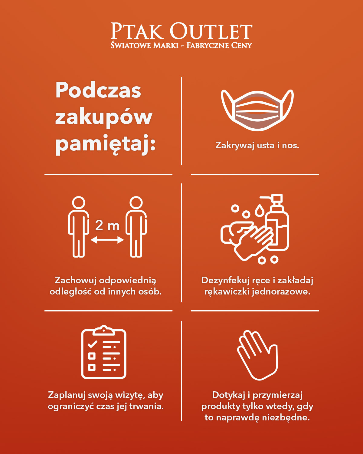 Niesamowicie cieszymy się, że zgodnie z najnowszymi decyzjami możemy ponownie otworzyć salony w naszym centrum. Zapewnienie wszystkim gościom oraz pracownikom Ptak Outlet należytego bezpieczeństwa to nasz priorytet. Dlatego wdrażamy zalecenia Głównego Inspektoratu Sanitarnego i wprowadzamy liczne środki ostrożności. Zapraszamy na #BezpieczneZakupy i zachęcamy do korzystania z naszych promocji.